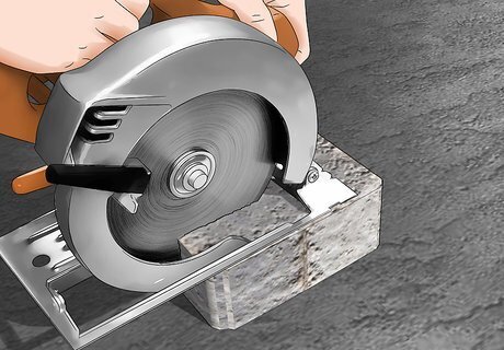 Cut the pavers to fit if necessary. Some full-sized stones may be too big to go in a certain spot. In this case, a wet saw or circular saw with a diamond blade, which can be rented from a home improvement store, will be required to cut through the hard stone. Assuming that you don’t have access to a power saw, you can also break down the pavers the old fashioned way using a mallet and chisel. When you come to a paver that won’t fit, mark it with a piece of chalk so you’ll know where you need to cut. Always wear gloves, a face mask, and ear and eye protection anytime you’re working with power saws.