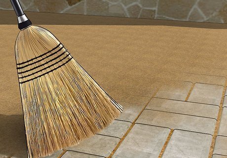 Fill the gaps between the pavers with another layer of sand. Spread an additional ½ in (1.25 cm) of levelling sand over the tops of the stones. Use a broom to carefully push the sand into the spaces between the pavers. Sweep in several different directions to fill the joints completely. Any remaining sand can be swept off later. Jointing sand can offer a permanent alternative to ordinary sand. This substance contains additives that form a solid bond after being exposed to moisture. Vacuum up any stubborn sand that collects where it's not supposed to, or use a leaf blower to blast it out into the far reaches of the yard.