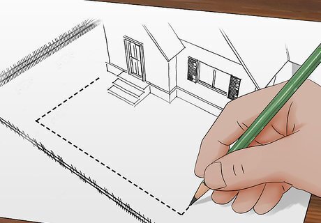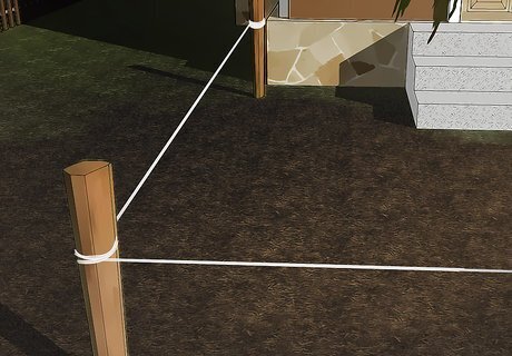 Line off the planned dimensions of your patio. Once you’ve got an idea of where you want the patio to go, drop a few garden stakes to mark the perimeter. Use a tape measure to make sure your boundary lines are straight and even, then close in the perimeter with string or marking paint. When building a patio with a curved perimeter, bend a garden hose into shape and use it to serve as a rough visual aid.