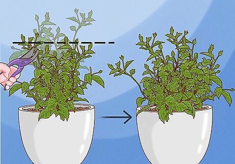 Prune hibiscus to keep it from getting too large and to encourage fullness. Tip each tall, upright branch when you re-pot in spring to encourage side growth and fullness. Using bypass garden pruning shears cut each branch back to the second leaf node from the tip. Cut just before the node. You can prune back to just before any leaf node to reduce the height or width of the hibiscus. Make sure to leave 2 to 3 leaf nodes on each stem or remove the stem completely.