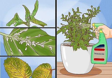 Examine your hibiscus regularly for pests. Look for curled or wrinkled leaves. Look for lots of yellow, browning, spotted or falling leaves. Look for insects on and under leaves. Look for fine webbing on leaves and stems. Treat insects with a houseplant insecticide if pests are suspected.
