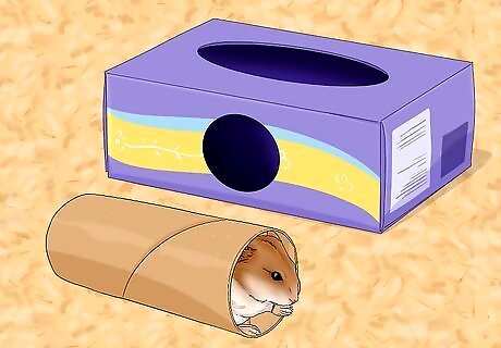 Be sure that you have lots of toys for the hamster to enjoy. Toys such as toilet paper rolls, empty tissue boxes, tubes, tunnels, nest boxes, PVC piping, and hamster chew toys are fun for your hamster. Most hamster owners simply give the hamster a wheel and a ball to enjoy. As a result, the hamster will start to have unhealthy habits such as pacing and/or chewing the bars of a wire cage, if housed in a wire cage. Your hamster needs more than just wheels and balls to occupy itself. Have enough toys so that you can rotate them and keep your hamster interested.