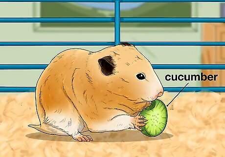 Give it treats. Regularly feed treats twice or three times a week. Hamster favorites include carrots, cucumber, apples, bananas, peppers, lettuce, celery, kale, collard and dandelion greens, and a bounty of other vegetables and fruits. Some of these foods can also be used in a hamster's daily diet. Many pet store treats, like yogurt chips and hamster chocolate drops are mainly made of sugar and fat, which are not good for the hamster, and should be avoided. Some veggies and fruits are NOT safe to feed to your hamsters. Onions, almonds, beans, potatoes, fruits with seeds, avocados, chives, eggplants, scallions, spices, leeks, garlic, iceberg lettuce, tomatoes, and citrus fruits are big no-nos.
