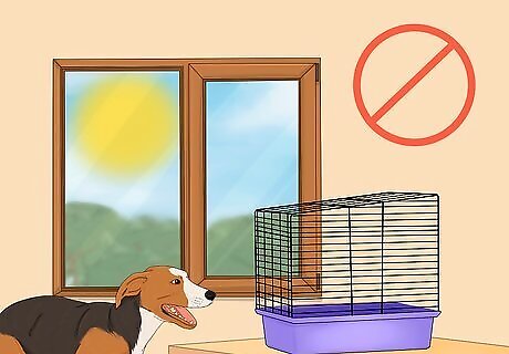 Place the cage in a safe place. Make sure there is plenty of ventilation. Don't place the cage in front of a hot window. Make sure to find a place that is quiet and free of any other household pets such as dogs and cats. This will reduce the stress of your pet hamster. At no point should you let your dogs or cats interact with your hamster.