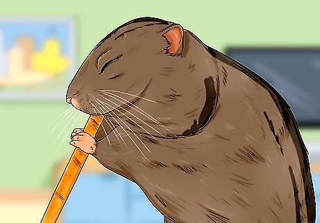 Give your hamster a chew stick. These come in many different sizes, colors, and flavors. Since your hamster’s teeth grow constantly, it'll need to slowly grind them down. Chew sticks are good for this. Keep trying new ones until you find one your hamster enjoys. Some hamsters will shun all chew sticks. If this is the case, you can expect your hamster to chew on other things in its habitat like the bars of its cage.