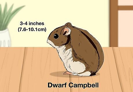 Think about what size hamster you want. Syrian hamsters may reach 5-7 inches (12.7-17.8 cm) in length as adults. Dwarf Campbell hamsters and Dwarf Winter White hamsters reach 3-4 inches (7.6-10.1cm). Chinese hamsters can grow to be 4-5 inches (10.1-12.7cm) long. And Roborovski hamsters barely reach 3 inches (7.6cm) in length as adults.