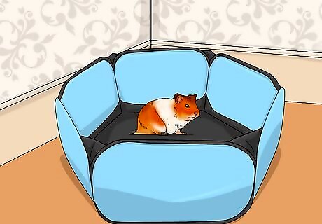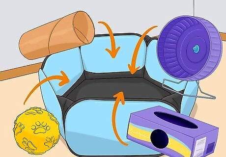 Set up a playpen. Your hamster will relish the chance to explore outside of their cages. Having play areas also helps when you clean the habitat and need a place to put your hamster where it can't escape. You can use a plastic storage bin in your house or a small animal playpen sold in pet stores. Make sure that there are no dangerous items that the hamster has access to (such as electrical cords which your hamster will chew on) and that the room is escape-proof.