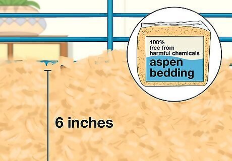 Make up your hamster’s bedding. On the ground, there should be a layer of at least 6 inches of bedding, however 10 inches is preferred. This might seem like a lot, but hamsters dig large tunnels in the wild. Many hamsters don't dig if there is too little bedding, so make sure to always add a big layer. Even if your hamster does not appear to be digging, leave the bedding inside in case your hamster really is or would like to start. Softwood shavings such as pine and cedar are just not good for hamsters, as they cause many health issues. They can cause respiratory problems and may contain harmful oils. However, aspen bedding does not contain the same harmful oils and is perfectly safe for your hamster. Never use cotton bedding. This is very dangerous for your hamster because it is indigestible, and strands of the bedding can wrap around limbs and extremities cutting off circulation and potentially killing your hamster. Make sure that the bedding that is used can support tunnels, and will not collapse when the hamster tries to burrow.
