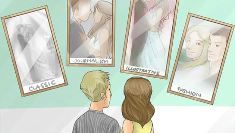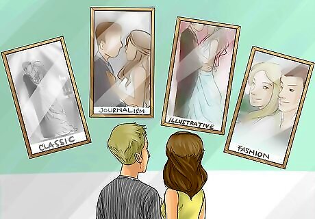 Decide what style of wedding photography you prefer. There are a number of different styles of wedding photography, and different photographers will specialise in different styles. Take some time to read up on and learn about the different styles and think about which one suits you best. Some of the main wedding photography styles are as follows: Traditional, or classic: here a photographer will work from a ‘shot list’ to make sure that they capture all the traditional pictures, and those the couple have specifically requested. Photojournalism: this is more of a documentary-style, where the photographers will follow you and take fewer ‘posed’ pictures, instead trying to tell the story of your wedding in a normal naturalistic style. Illustrative photography: this style is a combination of the first two. It includes posed pictures, but there is more emphasis put on relaxed and informal poses, albeit still with careful composition. Fashion: this style tends to be more dramatic than the others, and will make the subjects appear more glamorous and styled.