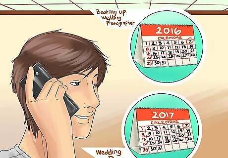 Start looking early. Booking your wedding photographer should be one of the first things you do after you have booked your venue. Wedding photographers are in high demand, especially in the busiest times of year for weddings, and many of the best ones will be booked up a year in advance. If you are having an out-of-season wedding, or getting married on a Sunday, a top photographer will be easier to find at relatively short notice. For weddings at the most popular times, look at least a year in advance. For weddings at less popular times, six months might be enough.