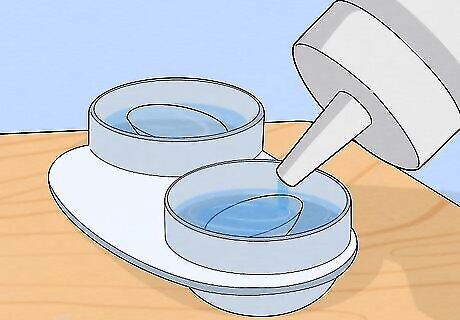 Keep your contacts clean. Always wash your hands well with soap and water before touching your contact lenses. It's recommended that you clean your contact lens case every day, and change your case at least once every 3 months. Never share your colored contact lenses with someone else. Homemade contact lens cleaning solutions have been linked to serious eye infections. Always purchase FDA-approved saline and cleaning solution. Contact lens cases are designed to be disposable. Anytime you get a new bottle of solution, you should throw away the old case and get a new one. Most bottles of solution now come with a case.