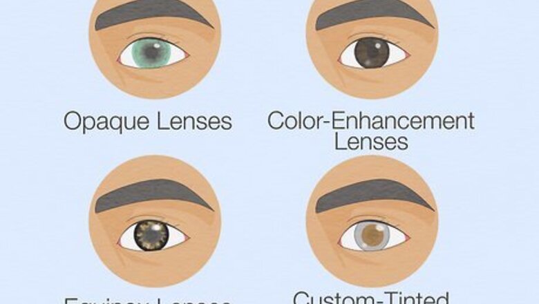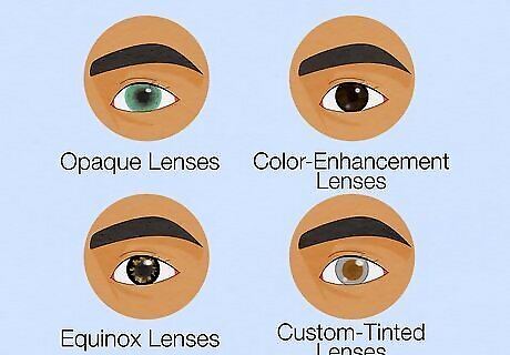 Learn more about colored contacts. Decorative colored contacts cover your iris in a new color. This can closely match your natural color to enhance it, or it can be dramatically different. Colored contacts will never look exactly the same on any two people. Opaque lenses are meant to entirely cover your natural eye color. If you have dark eyes, you might need to get opaque lenses in order to alter your eye's natural color. Color-enhancement lenses are intended to shade your existing eye color. If you have light colored eyes, these lenses can brighten your natural shade or change it altogether. They may not have any effect on dark eyes, however. Equinox lenses are lenses that have a dark ring around the iris. It's both a subtle and a dramatic effect, particularly in light eyes. It's subtle because it's not immediately recognizable what is different about the person, but it's definitely noticeable. These are sometimes called "circle lenses". Custom-tinted or sports tinted lenses are increasingly popular choices. These are both cosmetic and practical, as the choice of color may enhance sports ability. Colored contacts can reduce glare, enhance contrast sensitivity and heighten depth perception. For example, a tennis player may wear green contacts in order to see the tennis ball more clearly.