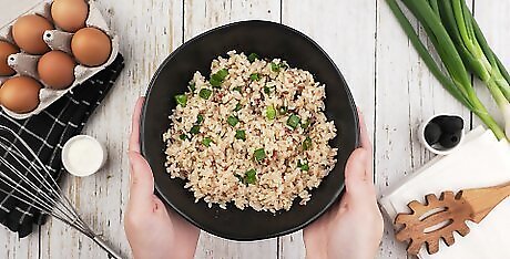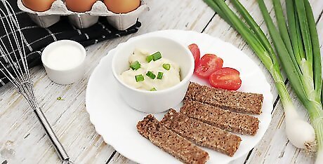 Make eggs. Eggs are a healthy and easy food. They contain a lot of vitamins and minerals, and though they contain cholesterol, they have been found to raise levels of good cholesterol. You can eat eggs for any meal, not just breakfast. You can also have them as a snack. Try scrambled, fried, boiled, or poached eggs. You can also make egg dishes, like frittatas and casseroles. Boiled eggs make great healthy snacks. Try to buy cage-free, vegetarian-fed, organic eggs if possible.