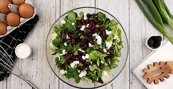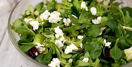 Buy bags of salad. Fresh salads often come premixed in bags in the vegetable aisle. These may be mixes of different types of lettuce, kale, and spinach. All you need to do is open the bag and add any extra toppings, such as sliced carrots, onions, mushrooms, low fat cheese, or nuts. Try adding one or two tablespoons of light dressing, such as balsamic vinaigrette or soy and sesame dressing. Avoid cream-based dressings.