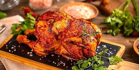Choose a fresh rotisserie chicken. Most grocery stores have cooked, rotisserie chickens that are ready to eat. These are freshly made, and they make a great meal. You can also save the leftovers for a sandwich or salad the next day. You can add frozen or premade mashed potatoes as a side. Steam some frozen peas or roast frozen broccoli in the oven for a quick vegetable side.
