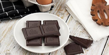 Grab a bar of dark chocolate. Dark chocolate is a healthy sweet snack if enjoyed in moderation. You can pair dark chocolate with other easy foods, like an orange, pomegranate, or nut butter. You can buy individually wrapped pieces of dark chocolate or slowly snack on a bar. Make sure to choose a dark chocolate that is at least 60% cocoa. You can also toss some dark chocolate chips into trail mix and yogurt, or just grab a handful to ease a sweet craving. Use dark chocolate to make a healthy, energizing sweet snack that's high in protein, antioxidants, and magnesium. Just melt dark chocolate chips in a microwave-safe dish for about 60 seconds. Then, stir in 1/2 cup of nuts or seeds. Pour them into a cupcake pan lined with paper liners and freeze or refrigerate the cups until they're set.