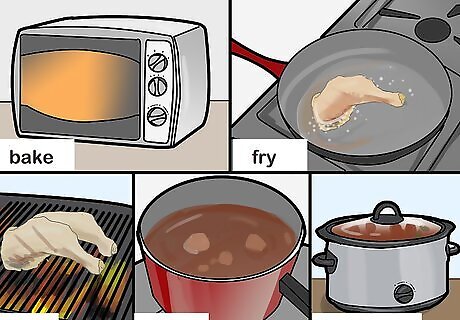 Pick how you will cook your meal. The method of cooking your chicken is extremely important in determining the cut of meat you should use. This is because the thickness, flavor, and texture of a cut will be impacted by the cooking process. If you choose to bake your chicken, you can pick just about any specific cut of meat, but the amount of time you bake may vary on thickness. You can fry (pan fry or deep fry) just about any cut of meat, but make sure to fry thicker pieces longer and to pull out smaller pieces so they don’t overcook. If you decide to grill or BBQ your chicken, you’ll have to make sure you cook specific pieces for longer or shorter amounts of time as they may dry out. When stewing meat, you’ll want to either drop in whole pieces and allow them to fall apart in the stew or broth, or you can precut them. Make sure you're prepared for the slow cooking process. You may need to invest in a slow cooker or a crock pot.