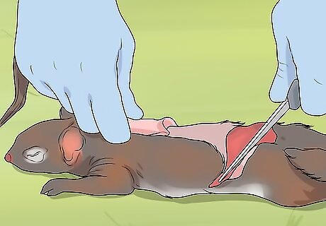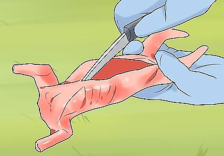Make a shallow cut lengthwise along the center of the belly. Once you’ve skinned the squirrel, you can start cleaning out the entrails. Start by pinching the stomach and making a small 3 cm (1.2 in) cut between the hind legs. Continue cutting until the you reach the neck. Be careful not to cut too deeply. If the knife goes in too far, you might accidentally cut the entrails. If you’re using a pair of game shears, another option is to insert the tip of the shears into the anus and start cutting up through the pelvis to the neck. Before starting to cut into the squirrel’s belly, examine the carcass closely and remove any hair that is still stuck to it.