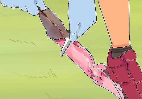Remove the head and feet. It is easiest to use a pair of game shears for this step. Cut through the meat of the neck and snap the bone to remove the head, and cut at the joints just above the feet to remove them and the remaining hide. Dispose of the hide, head, and entrails by burying them or carrying them out and taking them to a landfill.