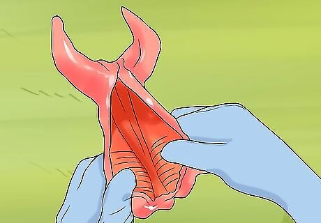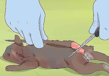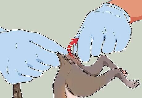 Pluck out hair at the base of the squirrel’s tail. You can use your thumb and index finger or a pair of large tweezers to pluck the hair. Removing this hair will make it easier for you to cut through the tailbone. Pluck out just enough hair to give yourself a clean area to cut, or around 2 centimetres (0.79 in) in width. Don’t forget to put on your field dressing gloves before you start to skin and clean the squirrel.