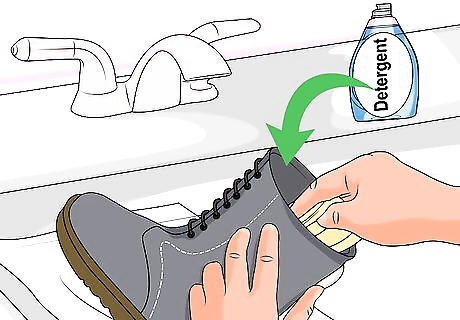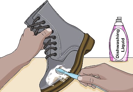 Use dishwashing liquid. For stains that remain after cleaning with water, use dishwashing liquid. Dish soap will bind to stains and remove them more effectively than water alone. Pour the liquid directly onto the stain and rub thoroughly with a cloth or toothbrush. For best results, leave soap on the boots for several minutes, then blot it away with a damp cloth.