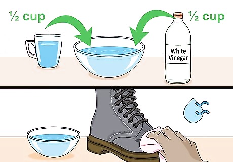 Remove salt stains with vinegar. In a small bowl, mix 1/2 cup (4 oz.) of water with ½ cup (4 oz.) white vinegar. Dip a cloth into the mixture and wipe it over your boots. Let them air dry.