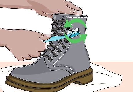 Remove stubborn dirt with a toothbrush. If stubborn dirt remains after you wipe down your boots, use a toothbrush to continue cleaning. Place boots on top of paper towels, or on an easy to clean surface. Use small, circular motions to loosen caked on grime.