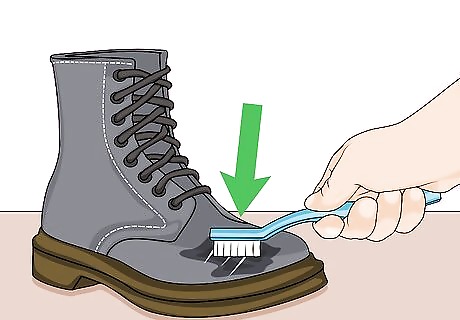 Use a stiff brush. Use a stiff nylon bristle brush or a barbecue brush to target minor stains. Brush boots outdoors or over a covered surface to capture any dirt that might fall off of your boots. Rub the brush over the stains vigorously to remove them.