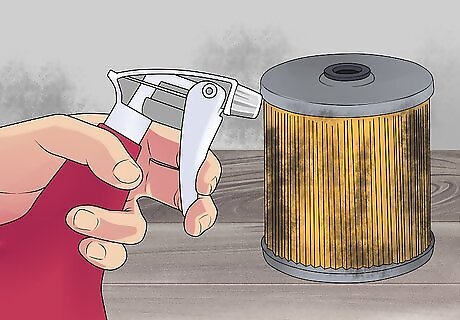 Spray the filter in cleaner. Look for a cleaner made for cleaning car parts or specially formulated for the air filter. You can also use mild soap and water to clean the filter. Spray the entire filter with the cleaner. Let it soak into the filter for 10 minutes. You can find cleaner for air filters online or at an auto body shop.