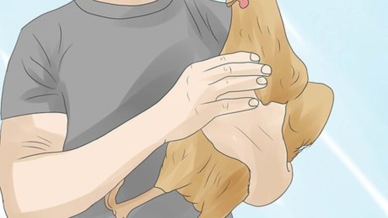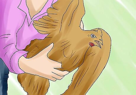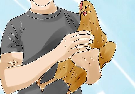 Catch the chicken. They're quick little things, so this is easier said than done. If your chickens are in a pen, it helps to have a partner to corner the chicken and catch it. Consider using a box to enclose the chicken quickly. If the chicken starts flapping its wings, gently hold them down with your hands, pressing them against her body, until the chicken calms down some. During the procedure, be careful of their claws and beak. Use two hands to hold them by the breast with their legs tucked back and their wings secured. This usually makes them go fairly docile, making them easy to manage.