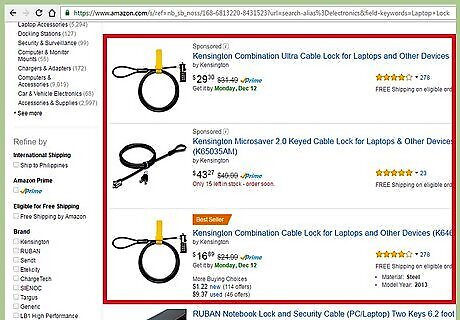 Buy and use a laptop lock to secure your laptop to a hard-based item while you take a quick break (such as to use the restrooms). They can be purchased at most electronics and office-supply stores. Loop this lock cable to a sturdy, non-movable object, and turn the key to secure it. However, don't leave your device unchecked for long. If you must leave your laptop while you run to the bathroom, check in with an employee to ask them to watch over it - and keep in mind that this doesn't mean they'll be legally responsible if it does get stolen. If you want complete security, pack it up and bring it with you.
