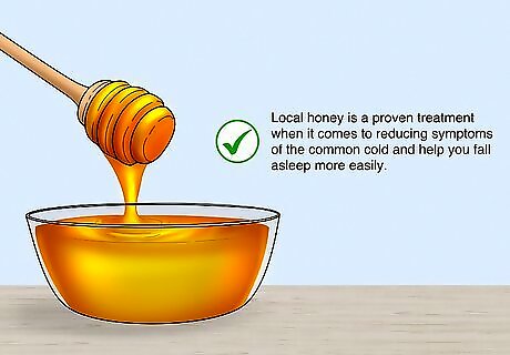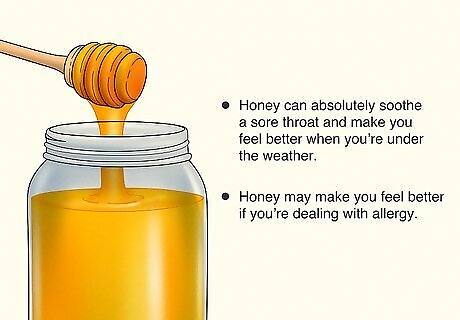Make some tea or simply swallow 1-2 teaspoons (5-10 milliliters). How you consume the honey should boil down to your personal preferences. If you’re feeling under the weather, try mixing a spoonful of the honey into some hot tea or lemon water. You can also simply eat the honey directly with a spoon if you prefer. You won’t get more relief by consuming more honey. If a spoonful or two doesn’t bring you any relief, don’t keep eating more of it.