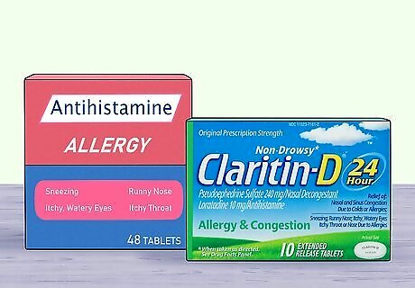 Take an antihistamine and/or decongestant to curb the issue. When it comes to fast relief, your best bet is a combination medication that contains both an antihistamine and a decongestant (Claritin-D and Allegra-D are the most popular brands). These will help reduce any sneezing, itching, and sinus issues you’re experiencing. If you want something more immediate, give a nasal spray a shot. You simply spray a cromolyn sodium solution directly into your nostrils to relieve pressure and treat the symptoms directly. Cromolyn sodium is a basic anti-inflammatory solution that will clear out a runny or stuffy nose. For children aged 6-11, they can take 30 milligrams (or 5 milliliters) up to 4 times a day. Anyone 12 years of age or older can take 60 milligrams (or 10 milliliters) up to 4 times a day. If you find either an antihistamine or decongestant alone are enough to help you get through the allergy season, it’s totally fine to just take one of them.