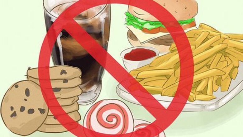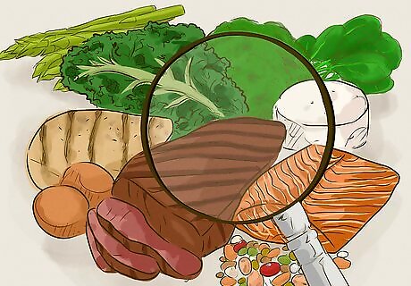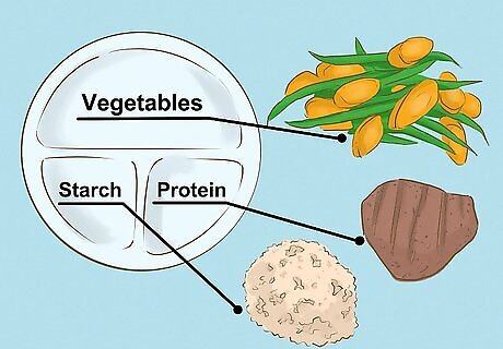 Balance your meals with protein and vegetables. Eating balanced meals consistently can be significantly helpful in keeping your blood sugar levels steady. When planning out your meals, choose a balance of protein, fruits, vegetables, starches, and fats. Opt for lean proteins, such as chicken breast, fish, and beans. Try to limit your intake of fats, particularly trans fats, which are often found in processed foods. Focus mainly on good fats. Monounsaturated fats and polyunsaturated fats are good fats, and they are found in foods like nuts, sunflower oil, olive oil, fatty fish, flaxseeds, and canola oil. Avocados and peanut oil contain good fats as well, but they’re also calorie-heavy. Carbohydrates quickly metabolize, meaning they are digested and absorbed quickly. Because of this, they’re able to give your body the quick energy it needs. Protein takes longer to metabolize, so it helps sustain energy. Fruits and vegetables give you fiber, which slows digestion, adds bulk to your diet, and helps stabilize your blood sugar.