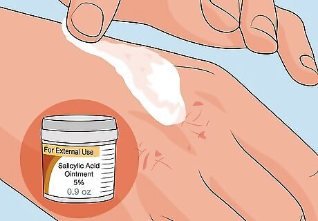 Apply salicylic acid on scaly skin to prevent cracking and flaking. Look for an ointment or lotion that contains salicylic acid at your local drugstore. Rub a coin-sized amount of the lotion in your hands before spreading it over your affected patches of skin. Work the lotion until your skin absorbs it completely. Use your salicylic acid ointment up to twice per day. Salicylic acid is a keratolytic, which means it reduces excess skin and softens hardened patches of psoriasis. Stop using salicylic acid if it irritates your skin.