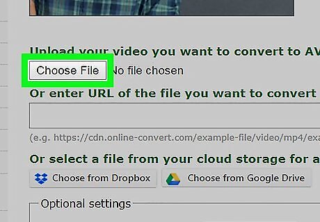 Click the Choose File button. This button is located below the "Upload your video you want to convert to AVI" heading at the top of the page. It will open a file navigator window, and allow you to select a file from your computer. If you want to convert an online image from a website, just paste the image's URL link into the URL field below the Choose File button. Alternatively, you can upload a file from your Dropbox or Google Drive. To do this, click Choose from Dropbox or Choose from Google Drive here.