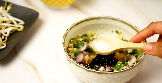 Toss the dressing with the bean sprouts, then chill for 30 minutes. Pour the dressing over the salad first, then lift the salad repeatedly with a pair of salad tongs. Place the salad into the refrigerator and wait 30 minutes. Serve the salad immediately afterwards. You can save the salad for later, but eat it within 24 hours.