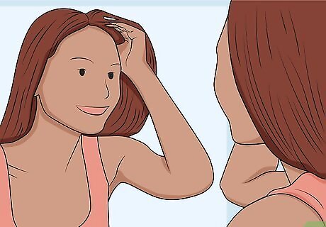 Disguise your roots with a colored spray, powder, or stick. There are a number of different root touch-ups on the market that will help you temporarily hide gray hairs. Depending on the product you choose, you either spray, brush, or draw the color onto any visible grays. In most cases, the color will last until the next time you wash your hair. To ensure your coverup doesn't wear off throughout the day, spritz your roots with hairspray to lock in the color. Some popular root touch-up products include Color Wow Root Coverup, Bumble and Bumble Bb. Color Stick, and L'Oreal Paris Magic Root Cover Up. In a Pinch? Try using matte eyeshadow that's similar to your natural hair color.