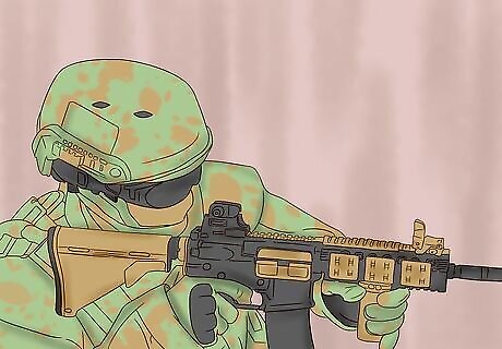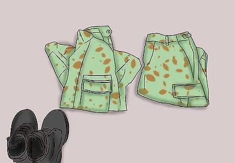 Select your combat shirt and pants. Normally, the traditional torso wear is a combat jacket which is either a button down or a zip up. A combat shirt is made of the same material as a combat jacket on the arms and neck, but the torso portion that ranges from the stomach to the collarbone and armpits is made of soft cotton which will keep you cooler. Once again when it comes to camouflage, you want both the shirt and pants to match completely. You would not want to wear MARPAT desert with M81 Woodland. You can mix up the colors if you choose solid color clothing. You can wear solid tan pants with a solid black combat shirt, and you can even wear all solid OD green with a tan plate carrier, tan gloves, and other exterior tan counterparts, or tan (or desert camo) shirt and pants with a black plate carrier or vest and other exterior black counterparts.