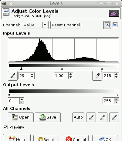 Observe the "dead spots" in the histogram. The histogram will show areas on the left and right which are "flat-lined", or close to it. Move the sliding arrow on the left past the dead spot on the left, and likewise for the arrow on the right. If there are colour casts on the image (e.g. if the original has, for example, a red haze) then don't hit OK yet; go on to the next step).