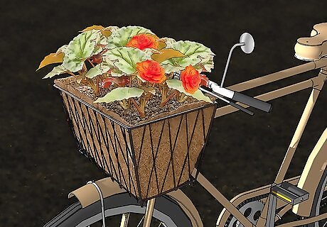 Line the baskets of an antique bicycle with coconut fiber to hold flowers. A vintage bicycle looks whimsical sitting in your garden, especially with blooms in its baskets. Prevent the soil from falling through the basket by placing a liner made of coconut fiber, which is also known as coir, in it before adding the potting mix. Sphagnum moss or a plastic bag, while not as visually appealing, will work instead of coir, too. Paint the bike a pretty pastel hue or a bright neon to add a pop of color. You can even match the flowers to the bike's colors. If you don't like the look of lined baskets, place the plants in flower pots first, then set the pots inside the baskets. Lean the bike against a fence or tree, mount it to a wall, or simply use the kickstand to hold it up.