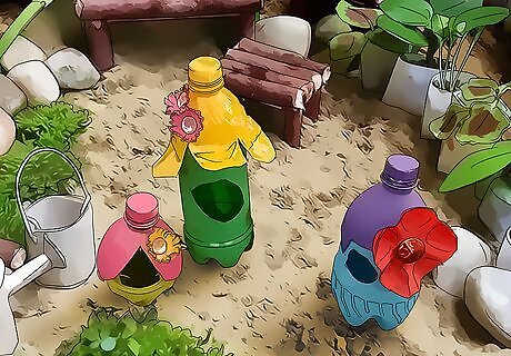 Build a magical fairy garden out of recycled materials if you have kids. A fairy garden is a tiny village hidden inside a larger garden where imaginary fairies live. Younger kids will love creating these magical places using everything from plastic bottles to milk jugs to toilet paper tubes. Soda bottles cut in half and painted in vibrant colors make for great fairy homes. Don't forget to cut doors and windows in the side before sticking it in the dirt! Set up your fairy garden in a tiny plot of the garden or fill an old bucket or cracked flower pot with soil to act as a separate fairy garden.