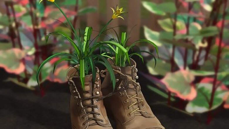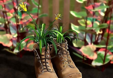 Plant your flowers in old boots or shoes for a playful vibe. When your boots or shoes start to look old and shabby, use them as makeshift flower pots instead of throwing them out. Any shoe will work but boots, like cowboy boots or work boots, are your best option since they have deep insides to fill with soil. Use a screwdriver or drill to make holes in the bottom of the shoes to allow water to drain out. If you have a fence in your garden, hang a row of colorful rain boots with plants inside to brighten up the fence.