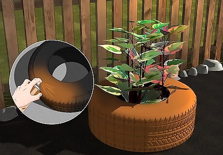 Paint a car tire and place flowers inside. Use non-toxic outdoor spray paint to coat your tire in the color of your choice. Set your painted tire in your garden and fill the center hole with soil to plant your flowers. Ask your local mechanic or auto shop if they have old tires they don't want. Lighter colors like pastel pink or pale blue reflect light better so they won't get as hot in the sun. This helps protect the plants. Spray designs like polka dots or stripes for a funkier feel. Stack tires in assorted sizes in a pyramid shape to create a multi-tiered garden. Choose plants with flowering vines, like moonflower or wisteria, to cascade down the stack.