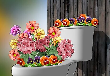 Fill a repurposed toilet or bathtub with flowers for a quirky planter. Pour your soil or potting mix into the toilet bowl or basin or into the bathtub. Arrange plants and flowers so they overflow out of the plumbing. Paint the toilet any color or design you'd like based on your style of garden. For example, an eye-popping blue works in a modern garden while a starry sky print is more whimsical. The older and more rusted the bathtub or toilet is, the more visually appealing it will be. Find used but clean bathtubs and toilets online or at an antiques store.