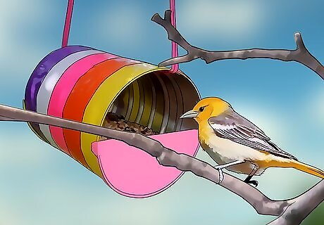 Create a bird feeder from an empty coffee can to hang in the garden. Open the bottom of the can with a can opener. Cut the lid in half and attach 1 half to each side of the can to provide a barrier to hold in the birdseed. Thread a piece of yarn or rope through the can to hang the feeder from a tree. Fill it with birdseed after you hang it. Paint the outside of the can and the lid with acrylic paint if you want a colorful feeder. Go with a solid color, a geometric pattern, or an artsy abstract design, for example. You can also decorate the can with duct tape, stickers, or washi tape. Avoid metallic colors or paints because these can scare away birds.
