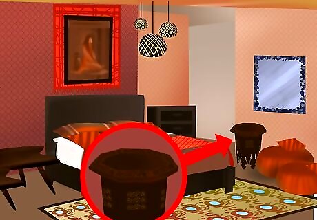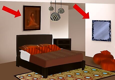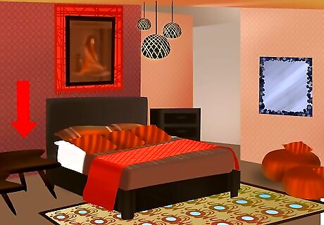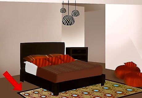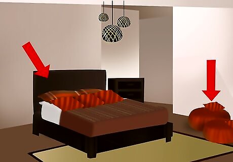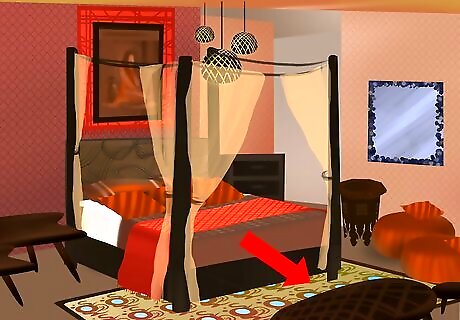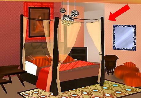 Get a statement piece bed frame. Use a large bed as the focal point of a Moroccan bedroom. Create an exotic oasis feeling for the room where you sleep. Try a four-poster bed with a canopy for a dreamy touch. You can also get a canopy that hangs from the ceiling to drape over the bed. Find or make a headboard for the bed that will become a statement piece for the room. Look for ornate wood carvings or inlay details, or simulate a headboard simply by hanging a rich tapestry or rug on the wall at the head of the bed.