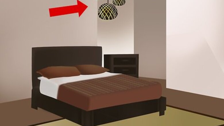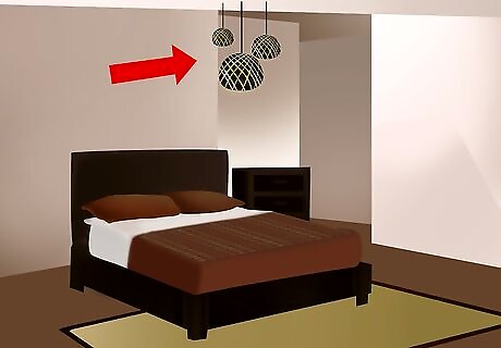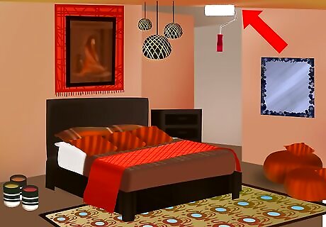Use hanging lamps to add ambience. Hang lamps made of metal and glass in your bedroom for mysterious lighting and an instantly recognizable Moroccan feel. Choose less modern styles for more of an old-world atmosphere. Get lamps with colored glass to match or complement the other colors in the room. Hang lamps or lanterns from the ceiling right over your bed, or from the frame of a four-poster canopy bed if you have one, for a cozy focal point. Try making your own lanterns or candle holders with glass jars and paint. Or, pick up string lights with round metal covers. Weave them through or around your headboard to create ambient lighting.