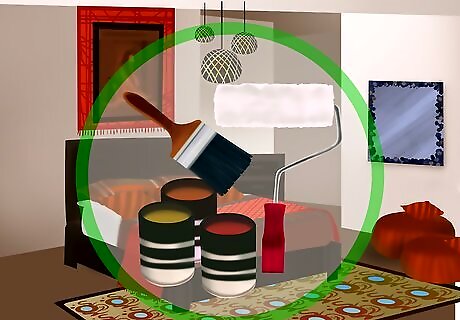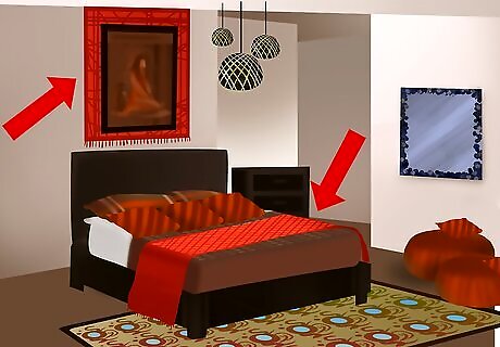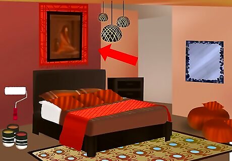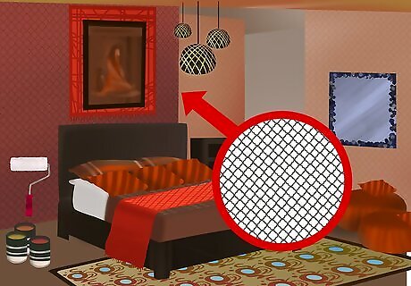 Create an accent wall as a focal point. Bring some extra color and drama to a room with a statement wall that is a different color or shade from the other three walls. Try a pattern, a complementary color, or a contrasting color. The best accent wall in a bedroom is the one behind your bed. Painting this wall creates an intimate, cozy feel. Try using a stencil to create a Moroccan-inspired pattern on your accent wall. Remember to paint the entire wall whatever color you want to show in the negative spaces of the stencil pattern, be it a white or neutral, or another warm complementary hue.