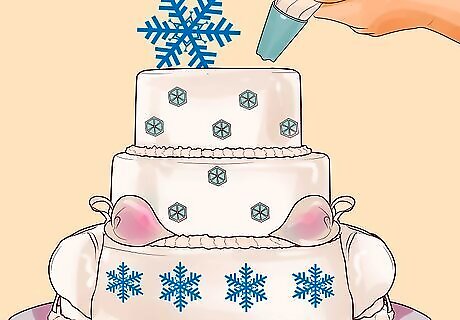 Accentuate your cake with seasonal touches. Take into account the time of year the wedding will be held. From your interview with the bride and groom, you should know roughly the features that will be on display at the wedding. If these coordinate with the season, your cake might benefit from matching that motif. For example, if the wedding will be held in winter and the bride desires a "Winter Wonderland" theme, you might include glitter and snowflake patters in blue and white icing on your cake.